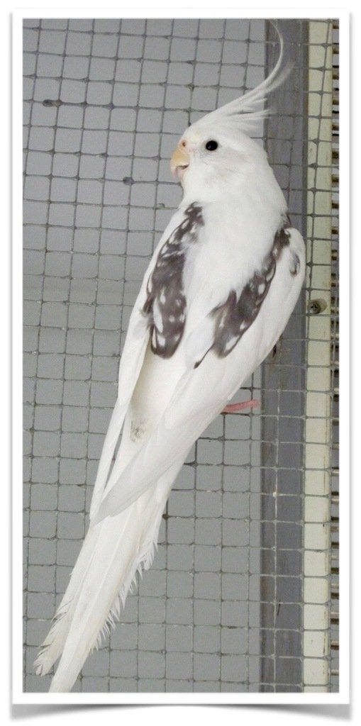 Diet: High Quality Cockatiel Seed, Australian Blend Goldenfeast, Fruits, Greens, Meats, Hard Boiled or Scrambled Eggs, Peanuts, Cuttlefish Bone, Dried Egg Food