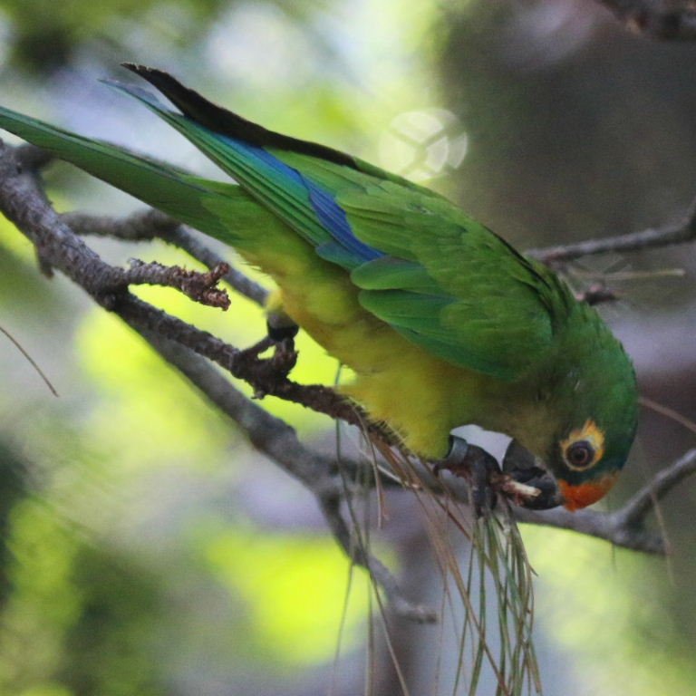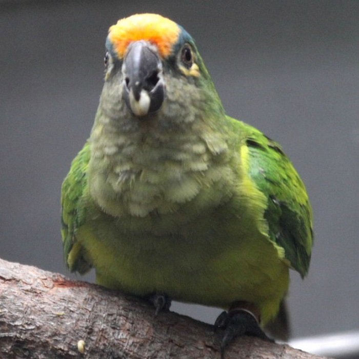 Peach faced conure, the Peach fronted conure has a grayish-green back with a lighter green (olive) color on the breast. The forehead and part of the crown are bright oranges. The rest of the crown is blue-green. There are black tips on the wings and blue tips on the tail. The beak is black.